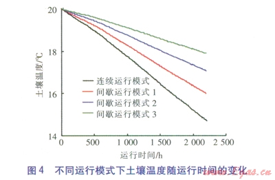 不同運(yùn)行模式下土壤溫度隨運(yùn)行時(shí)間的變化見圖4。由圖4可知,熱泵機(jī)組運(yùn)行時(shí)土壤溫度逐漸下降,下降幅度與地埋管換熱器的運(yùn)行模式有關(guān)。連續(xù)運(yùn)行模式下,到供暖末期,土壤溫度由初期的20℃降為14.72℃,降幅達(dá)5.28℃。間歇運(yùn)行模式1下,到供暖末期,土壤溫度為16.01℃,降幅為3.99℃。間歇運(yùn)行模式2下,到供暖末期,土壤溫度為l7.08℃,降幅為2.92℃。間歇運(yùn)行模式3下,到供暖末期,土壤溫度為17.91℃,降幅為2.09℃。由以上分析可知,當(dāng)日開停比減小時(shí),地埋管換熱器運(yùn)行時(shí)間減少,從土壤提取的熱量減少,土壤溫度下降幅度減小。但由于每天的恢復(fù)時(shí)間較短,不足以使土壤溫度有明顯的改變。
