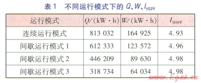 不同運(yùn)行模式下的Q、W、IHSPF見表l。由表1可知,間歇運(yùn)行模式下的IHSPF高于連續(xù)運(yùn)行模式,間歇運(yùn)行模式1~3的IHSPF接近。