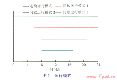對(duì)于地埋管換熱器間歇運(yùn)行模式,將每日的運(yùn)行時(shí)間與非運(yùn)行時(shí)間之比定義為日開停比。為了比較連續(xù)運(yùn)行與間歇運(yùn)行模式以及不同日開停比的間歇運(yùn)行模式下熱泵機(jī)組的性能,選取連續(xù)運(yùn)行模式和3種間歇運(yùn)行模式進(jìn)行對(duì)比分析,各運(yùn)行模式見圖1。間歇運(yùn)行模式1的日開停比為l8:6,間歇運(yùn)行模式2為13:11,間歇運(yùn)行模式3為9-15。模型不考慮地埋管換熱器間歇運(yùn)行對(duì)空調(diào)房間供暖的影響,認(rèn)為地埋管換熱器停用時(shí)段由太陽能熱水系統(tǒng)或其他低溫?zé)嵩刺娲寥涝础?span lang="EN-US">