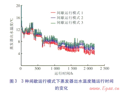 3種間歇運(yùn)行模式下蒸發(fā)器出水溫度隨運(yùn)行時(shí)間的變化見圖3。由圖3可知,3種間歇運(yùn)行模式下蒸發(fā)器出水溫度的下降幅度均小于連續(xù)運(yùn)行模式。對(duì)于間歇運(yùn)行模式l,蒸發(fā)器最低出水溫度為3.49℃,高于連續(xù)運(yùn)行模式,但仍然低于蒸發(fā)器出口溫度推薦范圍的下限,整個(gè)供暖期蒸發(fā)器出水溫度低于5℃的時(shí)間約260h。對(duì)于間歇運(yùn)行模式2,蒸發(fā)器最低出水溫度為4.95℃,高于間歇運(yùn)行模式l,而間歇運(yùn)行模式3的蒸發(fā)器最低出水溫度為5.86℃。因此,日開停比越小,熱泵機(jī)組的運(yùn)行工況越好。