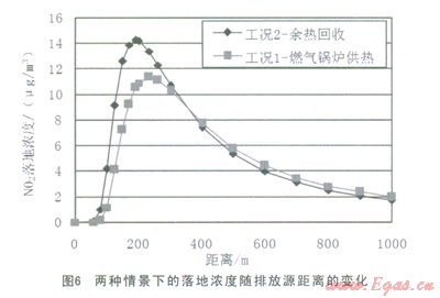 根據(jù)模型測算結果,余熱回收工況NOx最大落地濃度略有增加,增加了2.88mg/m3。從圖中可見,余熱回收工況NOx落地濃度達到峰值后,隨排放距離衰減速率大于燃氣鍋爐供熱工況,即余熱回收工況雖然最大落地濃度略有增加,但是迅速衰減,在距離排放源300米以后,兩種工況的排放就基本相當了。無論是哪一種工況,其排放均遠低于《環(huán)境空氣質(zhì)量標準》(GB3095—2012)中的二類區(qū)NO21h平均值(200mg/m3);且余熱回收工況最大落地距離減小了l7.6%,減小了污染范圍。