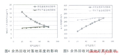 該項煙氣余熱回收技術對污染物擴散的影響可以從兩個方面分析,隨著排煙溫度的降低,一方面:煙氣余熱回收量逐漸增大,供相同的熱量節(jié)省了燃料,燃料的節(jié)省會使NOx排放速率減小,NO2的最大落地濃度減??;另一方面,隨著煙氣溫度的降低,污染物不宜擴散,煙氣本體的NO2的最大落地濃度增加,兩種因素的作用一正一負,因此需要對兩方面分別分析其綜合效果。