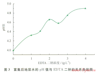 按培養(yǎng)基工的配方向地層水中加入各營養(yǎng)物質(zhì)后,分別向各瓶地層水中添加金屬離子絡合劑EDTA二鈉,使其在地層水中的濃度分別為0、1.0g/L、l.5g/L、2.0g/L、2.5g/L、3.0g/L、4.0g/L;調(diào)節(jié)各瓶地層水的初始pH值在7.0左右,然后在35℃下富集地層水中發(fā)酵產(chǎn)氫菌4d;調(diào)節(jié)富集后地層水菌液的pH值為6.0左右,連接好產(chǎn)氣裝置,研究不同梯度EDTA二鈉對產(chǎn)氫的影響。