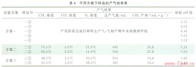 產(chǎn)氫廢料的產(chǎn)甲烷反應啟動較慢,大約在第35天才開始有氣體產(chǎn)生,且產(chǎn)氣速率遠比產(chǎn)氫階段要慢,持續(xù)時間較長,直到第55天后才停止產(chǎn)氣。第65天測試各個集氣瓶中的氣體組分(表4)。所有樣品中均未檢測到氫氣。