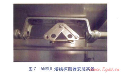 ④熔線探測器(見圖6)。熔線探測器布置在保護(hù)區(qū)的上方,通過額定溫度的合金熔線進(jìn)行自動探測,當(dāng)溫度超過額定溫度時,熔線斷開,鋼絲繩索松開。其安裝圖見圖7。