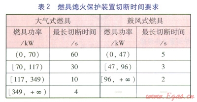 在工程實(shí)踐中,要求在燃具的每個燃燒器上都設(shè)置獨(dú)立的熄火保護(hù)裝置。另外,熄火保護(hù)裝置從檢測到?jīng)]有火焰到給出有效信號切斷燃?xì)夤?yīng)的整個操作過程必須是在安全合理的時間內(nèi),因?yàn)榇瞬僮鬟^程時間過長,燃具泄漏的燃?xì)膺^多,危險(xiǎn)性過高,保護(hù)裝置就失去了意義。對于不同類型及功率燃具的熄火保護(hù)裝置的最長切斷時間,澳門地區(qū)的相關(guān)燃?xì)夥ㄒ?guī)要求見表2。