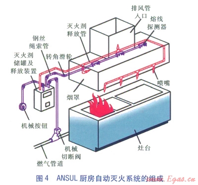 ANSUL廚房自動滅火系統(tǒng)的工作原理如下:廚房著火導(dǎo)致布在廚房保護(hù)區(qū)(即灶臺、煙罩及其排風(fēng)管入口附近等火災(zāi)危險(xiǎn)區(qū))的探測器熔線斷開,引發(fā)連接在探測器上的鋼絲繩索松開,滅火劑釋放裝置啟動,打開動力氣筒,釋放出高壓氣體進(jìn)入滅火劑儲罐,把滅火劑壓出并通過釋放管道輸送至噴嘴噴向保護(hù)區(qū),同時釋放裝置控制鋼絲繩索關(guān)閉機(jī)械切斷閥。ANSUL廚房自動滅火系統(tǒng)的組成見圖4。