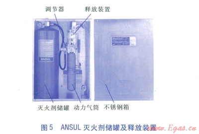 ②調(diào)節(jié)型釋放裝置。屬于一種裝有彈簧的機(jī)械、氣動釋放裝置,配置一個儲存二氧化碳或氮?dú)獾膭恿馔?,向滅火劑儲罐提供動力氣供?yīng),氣筒上安裝有調(diào)節(jié)器,氣筒的密封層設(shè)計(jì)成由釋放裝置擊穿。釋放裝置由熔線探測系統(tǒng)進(jìn)行自動啟動,釋放裝置還可以通過鋼絲繩索連接設(shè)置在保護(hù)區(qū)以外的機(jī)械按鈕進(jìn)行遙控手動開啟,另外可與大廈中央監(jiān)控系統(tǒng)的連接線兼容,將有關(guān)信號自動傳輸?shù)酱髲B中央監(jiān)控系統(tǒng)。ANSUL滅火劑儲罐及釋放裝置見圖5。