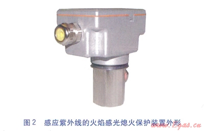 火焰感光熄火保護(hù)裝置利用火焰的光特性,采用感光式電子火焰?zhèn)鞲衅?,吸收火焰輻射?qiáng)度高的紅外線或紫外線,來探測或掃描火焰。代表火焰信號的初始電流經(jīng)放大后推動執(zhí)行繼電器。該類型熄火保護(hù)裝置的特點(diǎn)是探測器分辨火焰輻射來獲得正確的火焰信號,不需要接觸火焰,配置探頭變得很簡單。不需要火焰電極,探頭在高溫下不退化。另外,由于所有熱的物質(zhì)都向外輻射紅外線,感應(yīng)紅外線的火焰檢測裝置存在缺點(diǎn),即難以區(qū)分究竟是火焰輻射還是燃燒室受熱表面輻射(即使火焰熄滅),因此火焰檢測裝置的設(shè)計(jì)優(yōu)選感應(yīng)紫外線。感應(yīng)紫外線的火焰感光熄火保護(hù)裝置見圖2。