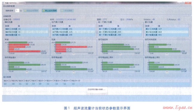 計(jì)量結(jié)果及當(dāng)前狀態(tài)參數(shù)模塊主要顯示計(jì)量設(shè)備的當(dāng)前狀態(tài)參數(shù)。狀態(tài)參數(shù)可根據(jù)要求分別以柱狀圖、數(shù)字或兩者結(jié)合的形式顯示,監(jiān)控人員可以直觀地觀測(cè)計(jì)量設(shè)備當(dāng)前運(yùn)行狀態(tài)是否正常。當(dāng)狀態(tài)參數(shù)出現(xiàn)異常時(shí),相應(yīng)的圖形(或數(shù)字)以紅色顯示(正常時(shí)以綠色顯示),以提醒監(jiān)控人員注意。超聲波流量計(jì)當(dāng)前狀態(tài)參數(shù)顯示界面見(jiàn)圖l。