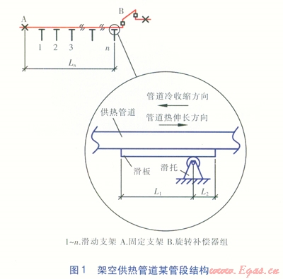 架空供熱管道滑動支架滑板的長度及安裝位置的確定,需要掌握管道在該滑動支架處的位移量。架空供熱管道某管段結(jié)構(gòu)見圖1。
