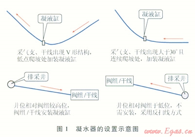 采氣管線輸送介質(zhì)為濕氣,容易在管線內(nèi)積液,由于采氣管線為聚乙烯管材,且采用多閥組串接方式,無(wú)法采用通球方式進(jìn)行管網(wǎng)維護(hù),為了提高管網(wǎng)輸送效率,在采氣管線上安裝凝水器,定期人工放水,該方法排水簡(jiǎn)單、實(shí)用、操作性強(qiáng)[10-13]。