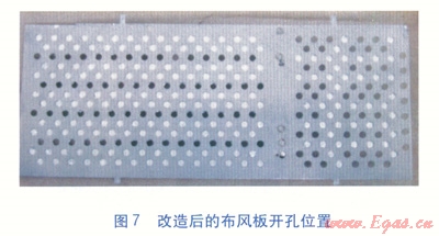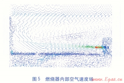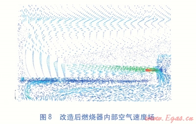 我們采取的優(yōu)化方案是在穩(wěn)壓室內(nèi)增設(shè)一個(gè)擋板,并對(duì)布風(fēng)板的開孔進(jìn)行重新布置。改造后的穩(wěn)壓室結(jié)構(gòu)及布風(fēng)板開孔位置分別見圖6、7。改造后,通過(guò)調(diào)節(jié)擋板位置可以獲得合理的一二次空氣量比例,保證一次空氣量能夠穩(wěn)定且不受燃燒過(guò)程的影響。二次風(fēng)由于處于一個(gè)楔形通道內(nèi),使得流動(dòng)更容易均勻,消除穩(wěn)壓室內(nèi)的渦旋氣流的產(chǎn)生。改造后燃燒器內(nèi)部空氣速度場(chǎng)見圖8。