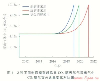 圖4給出3種不同剖面模型超臨界CO2驅(qū)天然氣采出氣中CO2摩爾百分含量變化的對(duì)比。由圖4可知,正韻律地層注超臨界CO2驅(qū)替天然氣突破最早,這是由于正韻律地層下部氣層的滲透率大,加之超臨界CO2密度明顯大于天然氣密度,導(dǎo)致超臨界CO2優(yōu)先傾向于向地層底部運(yùn)移,然后再沿縱向向上運(yùn)移,從而導(dǎo)致超臨界CO2較快在生產(chǎn)井突破的原因;而采氣井近井地帶的天然氣傾向于向地層上部運(yùn)移,地層中天然氣的運(yùn)移方向與超臨界CO2相同。因此,雖然超臨界CO2在地層中基本保持均勻推進(jìn),但由于天然氣的采出,不可避免地產(chǎn)生了超臨界CO2氣錐。反韻律地層中,受超臨界CO2與天然氣密度差引起的重力分異作用影響,整體上超臨界CO2傾向于向地層背斜底部運(yùn)移,而天然氣傾向于向地層背斜上部運(yùn)移,超臨界CO2前緣推進(jìn)較為均勻,氣體運(yùn)移對(duì)超臨界CO2天然氣過(guò)渡帶的擾動(dòng)較小,在生產(chǎn)井底部不產(chǎn)生超臨界CO2氣錐,因此超臨界CO2在生產(chǎn)井的突破最晚。復(fù)合韻律剖面中,超臨界CO2帶整體表現(xiàn)為非均質(zhì)指進(jìn),超臨界CO2主要優(yōu)先沿高滲層竄流,但總體上超臨界CO2傾向于向地層底部運(yùn)移,超臨界CO2在埋存同時(shí)向采氣井運(yùn)移推擠驅(qū)替天然氣,除了采氣井近井地帶的天然氣傾向于向地層上部運(yùn)移外,地層中天然氣的運(yùn)移方向與超臨界CO2相同,這會(huì)加劇超臨界CO2與天然氣的混合,對(duì)超臨界CO2天然氣過(guò)渡帶的擾動(dòng)較大。由于天然氣的采出,也不可避免地產(chǎn)生超臨界CO2氣錐,但由于超臨界CO2的氣竄主要發(fā)生在高滲層,因此氣藏底部產(chǎn)生的超臨界CO2氣錐比正韻律地層小。因此突破也略晚。
