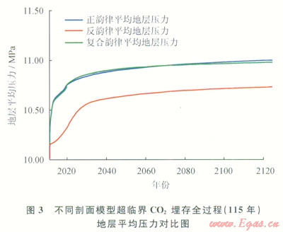 圖3給出了在剖面模型兩端底部注氣,中間頂部采氣的相同注采對(duì)應(yīng)關(guān)系下,3種氣藏剖面模型超臨界CO2驅(qū)氣及埋存整個(gè)過(guò)程(約115年)中地層平均壓力隨時(shí)間的變化對(duì)比曲線。預(yù)測(cè)結(jié)果顯示,在相同關(guān)井條件下(生產(chǎn)井采出天然氣中CO2摩爾百分含量達(dá)到l0%時(shí)關(guān)閉生產(chǎn)井),正韻律地層可連續(xù)保持8年的超臨界CO2注入和天然氣的開(kāi)采,反韻律地層可連續(xù)保持l0年的超臨界CO2注入和天然氣的開(kāi)采,而復(fù)合韻律地層介于兩者之間,保持在9年左右。由此可知,在剖面模型兩端底部注氣,中間頂部采氣的相同注采對(duì)應(yīng)關(guān)系下,反韻律地層超臨界CO2在采氣井突破后達(dá)到l0%的CO2含量的時(shí)間最晚,天然氣采出程度最高,埋存潛力最大;而且反韻律地層在超臨界CO2停止注入后持續(xù)封存過(guò)程中,地層壓力的上升幅度最小。根據(jù)超臨界CO2—天然氣體系相態(tài)特征研究結(jié)果[8-11],相同地層條件下,等質(zhì)量數(shù)的超臨界CO2—天然氣混合物其體積要比高密度的超臨界CO2的大。可知反韻律地層中,剩余天然氣擴(kuò)散彌散引起的超臨界CO2體積膨脹的程度相對(duì)最低,最有利于超臨界CO2的穩(wěn)定埋存。