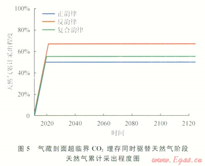 在超臨界CO2總注入速度和天然氣總開(kāi)采速度相同的條件下,生產(chǎn)井超臨界CO2驅(qū)替天然氣階段的收效時(shí)間長(zhǎng)短決定了地層天然氣累計(jì)采出程度的高低。圖5給出的天然氣累計(jì)采出程度曲線也證明了上述觀點(diǎn)。因此所選取的反韻律目標(biāo)氣藏實(shí)施超臨界CO2埋存的同時(shí)降壓驅(qū)替天然氣的效果是相對(duì)最好的。