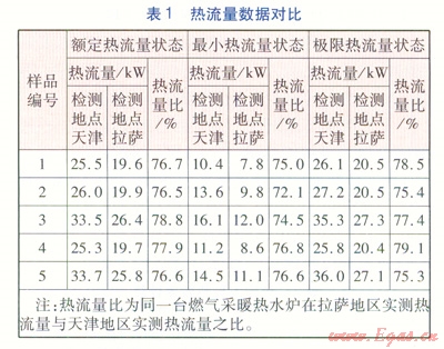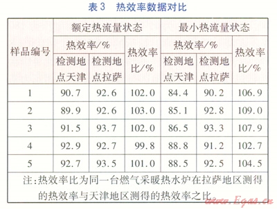 表3列出了5臺(tái)樣機(jī)分別在拉薩地區(qū)及天津地區(qū)測(cè)得的額定熱流量與最小熱流量狀態(tài)的熱效率對(duì)比數(shù)據(jù)。