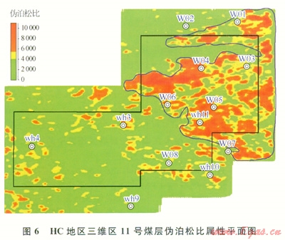 基于上述偽泊松比與煤的裂縫發(fā)育程度正相關(guān)的理論和實(shí)驗(yàn)研究,提取該區(qū)偽泊松比屬性(圖6),圖中紅色代表偽泊松比值大,推測(cè)藍(lán)色多邊形圈定的區(qū)域裂縫發(fā)育。同時(shí)把ll號(hào)煤層偽泊松比屬性和滲流曲線進(jìn)行對(duì)比發(fā)現(xiàn),滲流值較大的區(qū)域?qū)?yīng)于偽泊松比值大的范圍,因而可以推測(cè)這個(gè)區(qū)域?yàn)?span lang="EN-US">11號(hào)煤層滲透性較好的區(qū)域。