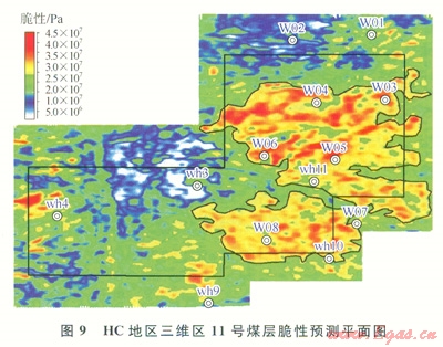 在沿11號(hào)煤層提取的脆性預(yù)測(cè)平面圖(圖9)上可以看到:黑色多邊形圈中的紅色區(qū)域指示煤層脆性比較高,主要位于工區(qū)中東部,壓裂時(shí)易產(chǎn)生裂縫;而西部地區(qū)巖石的脆性較低,不易于壓裂。