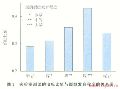 Gregory發(fā)現(xiàn)巖石的裂縫引起縱橫波速度比和泊松比的增大[7]。Ramos and Davis實(shí)驗(yàn)測(cè)試表明新墨西哥州Cedar Hill Field的煤層樣品泊松比和裂縫密度有關(guān)[8-9](圖2),可以看出煤層的泊松比隨著裂縫密度由低到高增加了30%。當(dāng)然實(shí)驗(yàn)室測(cè)量結(jié)果不等同于現(xiàn)場(chǎng)煤層的割理情況,但是圖2所揭示的泊松比和煤層裂縫密度之間的關(guān)系是可靠的,可用于現(xiàn)場(chǎng)煤層泊松比和裂縫密度的預(yù)測(cè),即煤層的泊松比和裂縫密度為正相關(guān)。在AVO理論中,假定vp/vs=2,偽泊松比反射率(Ds/s)等于截距與梯度之和的一半[9],反映的是反射界面兩側(cè)介質(zhì)的泊松比差值,與泊松比是呈正相關(guān)的。因此,AVO反演得到的偽泊松比反射系數(shù)屬性可以用于指示裂縫發(fā)育特征,偽泊松比值大,則裂縫發(fā)育程度高。
