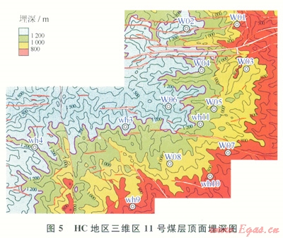 HC地區(qū)地處鄂爾多斯盆地東南邊緣的渭北沖斷褶皺帶上,受多期構(gòu)造控制或影響,使區(qū)內(nèi)含煤構(gòu)造呈現(xiàn)北東—南西向展布,總體構(gòu)造形態(tài)為北西傾向的單斜構(gòu)造。該區(qū)已實(shí)施了滿覆蓋面積100km2的三維地震勘探,主力煤層為5號(hào)煤層和ll號(hào)煤層,5號(hào)煤層厚度較小,但區(qū)域上分布相對(duì)較穩(wěn)定,厚度一般分布在1~9m之間,單層厚變化較大,W08井5號(hào)單層厚度可達(dá)9.9m;11號(hào)煤層在三維區(qū)內(nèi)厚度分布不穩(wěn)定,厚度相對(duì)較薄,最大單層厚度在10m左右。