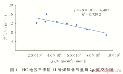 煤層含氣性預(yù)測(cè)的基礎(chǔ)是測(cè)井曲線分析。通過對(duì)研究區(qū)內(nèi)所收集到的井的含氣量與彈性參數(shù)交會(huì)分析(圖4)得到,該區(qū)11號(hào)煤層的含氣量隨密度、縱波速度、縱橫波速度比、lr值增大而減小,同時(shí)按線性關(guān)系擬合儲(chǔ)層含氣量與lr值之間的數(shù)學(xué)關(guān)系,相關(guān)系數(shù)為0.7292,認(rèn)為兩者的線性關(guān)系有一定的可靠性,可以用lr值來指示含氣量的變化,lr小值對(duì)應(yīng)含氣量的大值。