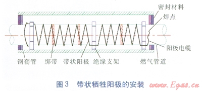 ②不可避免使用套管時(shí),可在套管內(nèi)部采取局部的陰極保護(hù)也是一種很有效的辦法。具體做法是:在套管內(nèi)的主管道上纏繞鎂陽(yáng)極帶或鋅陽(yáng)極帶或安裝鐲式陽(yáng)極[4]。當(dāng)主管道外防腐層為3PE防腐時(shí),推薦使用纏繞鎂陽(yáng)極帶的局部陰極保護(hù)。安裝鎂陽(yáng)極帶時(shí),可采用機(jī)械打磨的方法,露出里面的鋼管約3~5cm癌主管道上開(kāi)鑿一個(gè)合適的焊點(diǎn),采用電焊、鋁熱焊等焊接方式把鎂陽(yáng)極帶一端焊接到主管道上,根據(jù)不同的管徑按照一定的角度和間距,貼著管道的外壁緊緊纏繞。針對(duì)不同管徑,鎂陽(yáng)極帶有不同的纏繞角度:當(dāng)燃?xì)夤艿劳鈴?le;219mm時(shí),鎂陽(yáng)極帶沿管道外壁等距且與管道軸向成30°角纏繞;當(dāng)燃?xì)夤艿劳鈴綖?span lang="EN-US">219~377mm時(shí),沿管道外壁等距且與管道軸向成45°角纏繞;當(dāng)燃?xì)夤艿劳鈴?ge;377mm時(shí),沿管道外壁等距且與管道軸向成600角纏繞[4]。鎂陽(yáng)極帶另一端也要和起點(diǎn)一樣,焊接在主管道上,而且兩個(gè)焊點(diǎn)都要做好絕緣防腐。鎂陽(yáng)極帶纏繞施工完畢,套管兩端應(yīng)采用柔性的防腐、防水材料密封,并保證密封良好,防止水或其他雜物的進(jìn)入。纏繞鎂陽(yáng)極帶法的優(yōu)點(diǎn)是施工簡(jiǎn)單方便,缺點(diǎn)是鎂的電位較負(fù),保護(hù)年限不是很長(zhǎng)[4]。帶狀犧牲陽(yáng)極的安裝見(jiàn)圖3。