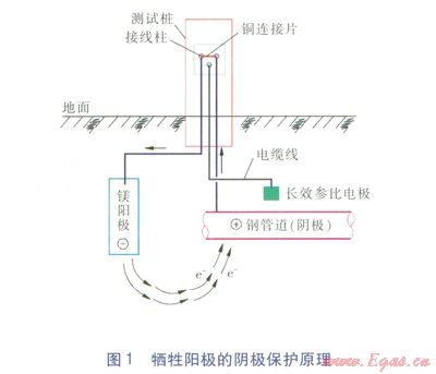 陰極保護(hù)分犧牲陽(yáng)極陰極保護(hù)法和外加電流陰極保護(hù)法。綠博公司主管道采用的是犧牲陽(yáng)極陰極保護(hù)法,其原理就是原電池的原理,是將一種比鐵更活潑的鎂陽(yáng)極與被保護(hù)的鋼管相連接,通過(guò)鎂陽(yáng)極的不斷氧化反應(yīng),向被保護(hù)的鋼管提供保護(hù)電子,使其獲得保護(hù)。犧牲陽(yáng)極陰極保護(hù)原理見(jiàn)圖l。