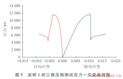 三維壓縮實(shí)驗(yàn)應(yīng)力 應(yīng)變曲線如圖5、6所示。巖石材料的塑性與脆性可根據(jù)應(yīng)力、應(yīng)變曲線上負(fù)坡的坡降大小來(lái)劃分。負(fù)坡較陡者為脆性,反之為塑性。由圖5、6可知:巖樣1和巖樣2在應(yīng)力分別為l2000psi(1psi=6.895kPa)和20000psi時(shí),應(yīng)變?yōu)?span lang="EN-US">0.01、0.009時(shí)破碎,屬于脆性巖石,且?guī)r樣2應(yīng)力、應(yīng)變曲線上的負(fù)坡較陡,故其脆性優(yōu)于巖樣1。