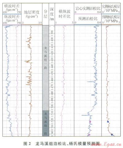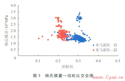整體龍馬溪組楊氏模量介于l×104~3.5×104MPa,平均為2.3×104MPa;泊松比介于0.1~0.37,平均為0.24。通過(guò)圖3可以看出,龍馬溪組一段楊氏模量平均值為1.4×104MPa,泊松比平均值為0.3;龍馬溪組二段楊氏模量平均值為l.8×104MPa,泊松比平均值為0.23。龍馬溪組二段較龍馬溪組一段具有低泊松比,高楊氏模量,說(shuō)明其脆性優(yōu)于一段。圖4為橫縱波時(shí)差比和泊松比的交會(huì)圖,可以看出龍馬溪組二段的橫縱波時(shí)差比明顯低于一段,說(shuō)明低橫縱波時(shí)差比參數(shù)用于表征頁(yè)巖的脆性程度是有效的。