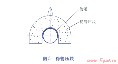管道穿越濕陷性黃土沖溝溝底時(shí)通常采取兩種敷設(shè)形式:第一種形式是管道直接在溝底敷設(shè),在管道上采取穩(wěn)管壓塊(見圖5)、護(hù)岸、護(hù)底措施;第二種形式是跨越,即在放坡后的坡面,選取一個(gè)地質(zhì)條件較為穩(wěn)定的位置,設(shè)置跨越基墩,管道跨過沖溝。