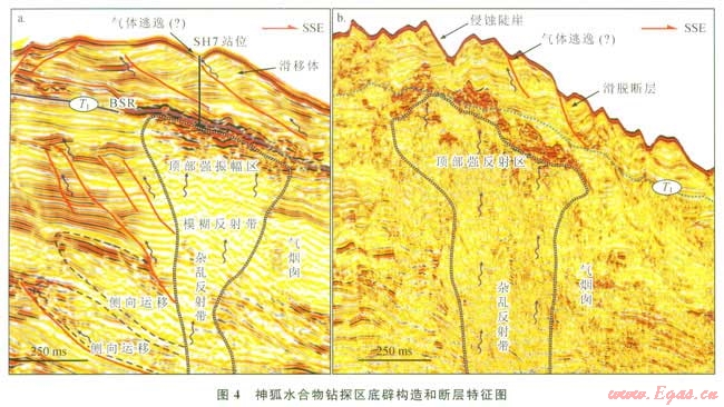 神狐水合物鉆探區(qū)內(nèi)沒有明顯的大尺度斷層,但是上新世地層中發(fā)育一些與氣煙囪相溝通正斷層(圖4-a)。這些斷層的存在為含氣流體的側(cè)向運移提供了通道,斷層附近存在的一些雜亂反射特征可作為流體發(fā)生短距離側(cè)向運移的證據(jù)(圖4-a)。此外,在更新世以來的地層中,鉆探區(qū)內(nèi)廣泛發(fā)育滑移沉積體(圖4-b)。在重力的誘導下,沉積層將順著滑脫斷層,沿著陸坡坡降的方向線由北向南發(fā)生整體的滑動。這些滑脫斷層呈雁列式排列,通??梢詼贤鉄焽韬秃5?/span>(圖4-b)?;摂鄬拥拇嬖谝环矫婵梢宰鳛榱黧w逃逸至海底的通道,另一方面也可為水合物的形成提供有限的空間,從而形成一些小規(guī)模的裂縫充填型水合物[19]。