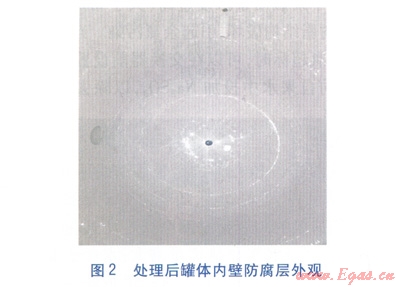 對(duì)于腐蝕穿孔情況,經(jīng)過實(shí)踐研究,我們總結(jié)了較為理想的處理方法,獲得了良好的效果。具體步驟為:對(duì)出現(xiàn)腐蝕穿孔的罐體拆卸后進(jìn)行打磨,除去罐體內(nèi)壁銹斑及破損的防腐層。然后對(duì)穿孔部位進(jìn)行同材質(zhì)補(bǔ)焊,并將焊渣打磨干凈,將適量的LG-001、LG-002防腐劑按比例混合后進(jìn)行防腐層涂敷處理,最后進(jìn)行烘干,如此重復(fù)兩次即可達(dá)到良好的防腐效果。該防腐技術(shù)為無毒、食品級(jí)防腐新技術(shù),成品表面強(qiáng)度高、彈性好,且表面光滑,抗機(jī)械損傷能力強(qiáng)。處理前后罐體內(nèi)壁防腐層外觀分別見圖1、2。