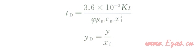 式中K為滲透率,mD;h為地層厚度,m;j為地層孔隙度;mg為氣體黏度,mPa·s;Bg為氣體體積系數(shù);cg為氣體壓縮系數(shù),Mpa-1;Zg為氣體偏差因子;T為地層溫度,K;y為空間坐標(biāo),m;yf為動(dòng)邊界空間位置,m;xf為裂縫半長(zhǎng),m;qsc為氣井產(chǎn)量,m3/d;qref為參考產(chǎn)量,m3/d;Gp為累積產(chǎn)量,m3;p為地層壓力,MPa;t為生產(chǎn)時(shí)間,h;下標(biāo)sc為標(biāo)準(zhǔn)狀態(tài),psc=0.1MPa,Tsc=293.15K;下標(biāo)i為地層原始狀態(tài);下標(biāo)D為無量綱量。