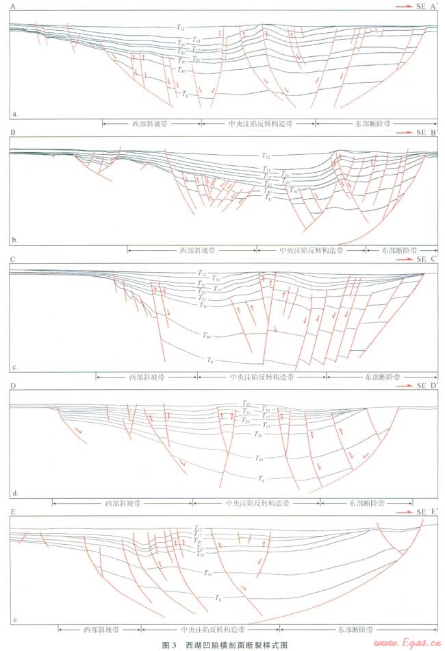 1)在斷裂空間分布上,西湖凹陷新生界發(fā)育下、中、上3個(gè)斷裂系統(tǒng):下部斷裂系統(tǒng)主要發(fā)育在古新統(tǒng)始新統(tǒng)構(gòu)造層,為基底卷入型張性正斷層;中部斷裂系統(tǒng)主要發(fā)育在漸新統(tǒng) 中下中新統(tǒng)構(gòu)造層,為擠壓型斷裂;上部斷裂系統(tǒng)主要發(fā)育在上中新統(tǒng)第四系構(gòu)造層,為張扭型斷裂,斷裂走向?yàn)榻?/span>E—W向。各層次斷裂系統(tǒng)中斷裂組合樣式具有顯著的差異:下部張性斷裂系統(tǒng)主要有斷階型、多米諾型、地塹、地壘等斷裂組合樣式,多與構(gòu)造部位有關(guān);中部壓性斷裂系統(tǒng)主要有正“Y”、反“Y”字形和簡單后沖型斷裂組合樣式,多與其所處部位的反轉(zhuǎn)強(qiáng)度有關(guān);上部張剪性剖面上為懸掛斷裂,平面上呈條帶狀和雁行狀組合。