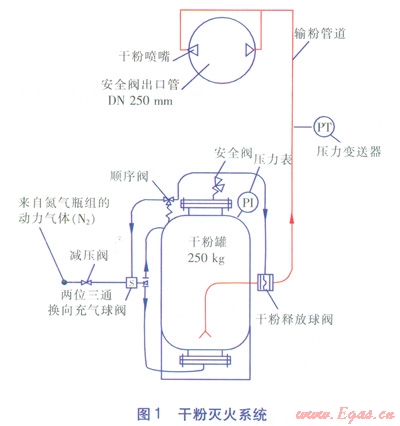 干粉滅火系統(tǒng)主要由氮?dú)馄拷M、減壓閥、干粉罐、管路系統(tǒng)及噴嘴等組成,見圖1。