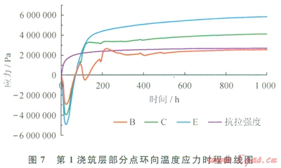 7為第l澆筑層部分點(diǎn)環(huán)向溫度應(yīng)力時(shí)程曲線。由圖7可知,在外罐施工期間,混凝土先受壓后受拉,在混凝土澆筑68h后,混凝土由受壓狀態(tài)轉(zhuǎn)變?yōu)槭芾瓲顟B(tài),在混凝土澆筑120h后,第1澆筑層底部某點(diǎn)所受拉應(yīng)力超過(guò)了混凝土的抗拉強(qiáng)度,底部混凝土開始產(chǎn)生溫度裂縫。B點(diǎn)應(yīng)力曲線存在上下波動(dòng)是由于B點(diǎn)易受上層新澆筑混凝土的影響;比較B、C、E點(diǎn)應(yīng)力時(shí)程曲線可知,混凝土離罐底越近,產(chǎn)生的溫度應(yīng)力越大。