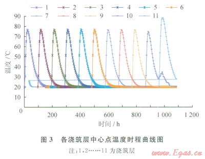 混凝土的內(nèi)部溫度與水泥種類、水灰比、初始條件、邊界條件、熱傳導(dǎo)系數(shù)等有關(guān),還與位置、時(shí)間有關(guān),有限元分析時(shí)采用式(1)對(duì)早齡期混凝土內(nèi)部的溫度場(chǎng)進(jìn)行求解,各澆筑層中心點(diǎn)溫度時(shí)程曲線如圖3所示。