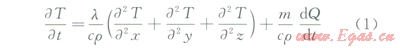 混凝土的熱傳導(dǎo)是一個(gè)瞬態(tài)過(guò)程,溫度場(chǎng)是齡期和空間函數(shù),混凝土中三維不穩(wěn)定溫度場(chǎng)的熱傳導(dǎo)微分方程為:
