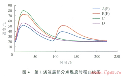 1澆筑層部分點(diǎn)溫度時(shí)程曲線如圖4所示。由圖4可知,在外界恒溫條件下,混凝土內(nèi)部溫度在其澆筑約ld后迅速達(dá)到峰值,之后開始緩慢降溫,在其澆筑約10d后趨于穩(wěn)定。由圖4還可知,外罐罐壁厚度中心最高升溫約為60℃,混凝土易產(chǎn)生深層裂縫;混凝土內(nèi)部與表面溫差為25℃,混凝土表面具有開裂的危險(xiǎn);頂部}昆凝土塊內(nèi)部溫度受上層新澆筑混凝土的影響比較大。因此AB測(cè)點(diǎn)在溫度下降階段有2030℃的溫度波動(dòng),數(shù)值分析表明,新澆筑混凝土對(duì)下層混凝土的影響深度約為1.2m。