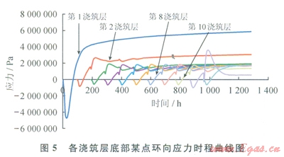 5為各澆筑層底部某點(diǎn)環(huán)向應(yīng)力時(shí)程曲線,圖6為部分澆筑層底部某點(diǎn)豎向應(yīng)力時(shí)程曲線。由圖5可知,在LNG儲(chǔ)罐外罐施工期間,溫度應(yīng)力分為壓應(yīng)力發(fā)展、壓應(yīng)力轉(zhuǎn)變?yōu)槔瓚?yīng)力及拉應(yīng)力趨于殘余應(yīng)力3個(gè)階段。比較圖5和圖6可知,混凝土外罐在溫度及重力荷載作用下,第一主應(yīng)力為環(huán)向應(yīng)力,與彈性力學(xué)理論分析的結(jié)果相符,而且現(xiàn)場(chǎng)施工經(jīng)驗(yàn)表明混凝土外罐在施工期間底部經(jīng)常產(chǎn)生豎向裂縫。由圖5知,第1澆筑層所受的溫度應(yīng)力明顯大于其他澆筑層,產(chǎn)生這種狀況的原因是第1澆筑層混凝土受到罐底的約束度相對(duì)較大;因第39澆筑層澆筑高度及約束狀況相近,所以其應(yīng)力變化曲線相似;第10澆筑層環(huán)向應(yīng)力曲線因受環(huán)梁澆筑的影響而產(chǎn)生2MPa的應(yīng)力波動(dòng)。
