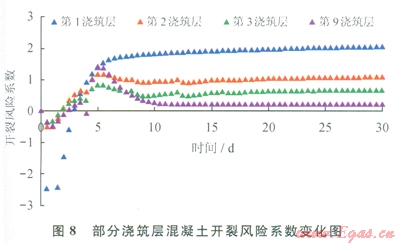 根據(jù)溫度應(yīng)力預(yù)測(cè)和判斷混凝土是否發(fā)生開裂,采用開裂風(fēng)險(xiǎn)系數(shù)評(píng)估,一般認(rèn)為當(dāng)開裂風(fēng)險(xiǎn)系數(shù)達(dá)到0.7時(shí),混凝土開裂的可能性已經(jīng)很大。