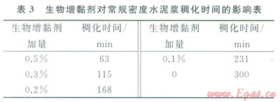 生物增黏劑對(duì)常規(guī)密度水泥漿常規(guī)性能的影響見表2、3。