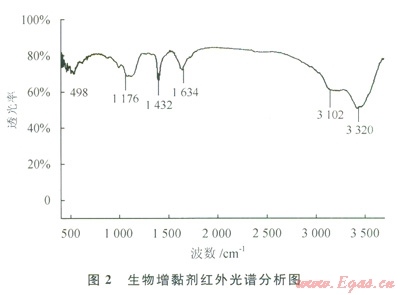 生物增黏劑的紅外光譜分析圖見圖2。由圖2可知其主要有羥基、羧基、醛酮基、酯基等。其b主鏈上含有D-葡萄糖、D-甘露糖、D-葡萄糖醛酸。每8個(gè)殘?zhí)腔?/span>D-葡萄糖醛酸有一個(gè)甘露糖支鏈。每16個(gè)殘?zhí)腔赡苡?/span>1個(gè)1-羧基-亞乙基D葡萄糖。