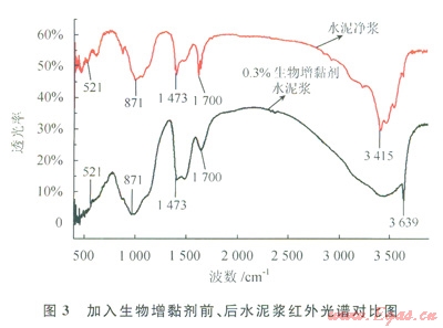 水泥凈漿與加入0.3%生物增黏劑的水泥漿的紅外光譜圖如圖3所示。由圖3可知,與水泥凈漿相比,加入0.3%生物增黏劑后水泥石中C3S的特征峰強(qiáng)度(871cm-1,521.04cm-1,440.55cm-1)有所增加,可能是生物增黏劑在一定程度上抑制了C3S的水化。
