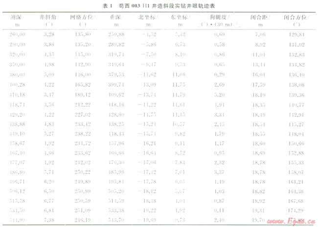 茍西003-H1井于2012年3月28日開(kāi)鉆,從400m開(kāi)始定向繞障,定向段400~624m,井斜由4°上升至12°,造斜段數(shù)據(jù)見(jiàn)表1。