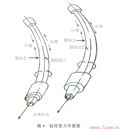 1930年,英國(guó)人古德曼(J.Goodman)簡(jiǎn)化了疲勞極限的曲線圖[6],根據(jù)他的疲勞理論可以得出,鉆桿的疲勞強(qiáng)度不僅與鉆桿自身的性能有關(guān),而且與其承受的平均應(yīng)力即拉伸應(yīng)力有關(guān),拉伸應(yīng)力越大,鉆桿疲勞所需的最低彎曲應(yīng)力幅越小,所以井越深、鉆桿越靠近井口,鉆桿就容易發(fā)生疲勞,其受力情況見(jiàn)示意圖4。