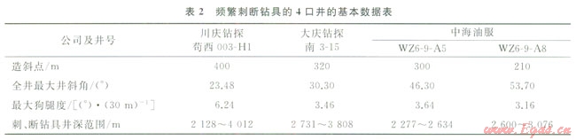 在Æ311.2mm井眼鉆至2128m開(kāi)始,先后發(fā)生了3次Æ127.0mm鉆桿加厚過(guò)渡消失區(qū)刺穿失效,其后又在Æ215.9mm井眼內(nèi)發(fā)生2次Æl27.0mm加重鉆桿中接頭刺穿失效,前后更換2套Æl27.0mm鉆桿無(wú)效,第3次更換Æl27.0mm Sl35×9.19mm大水眼鉆桿,約1個(gè)月后鉆具刺漏現(xiàn)象再次出現(xiàn),并在14d內(nèi)連續(xù)發(fā)生9次幾乎相同的鉆具失效。縱觀鉆具失效特征有3個(gè)共性:①失效部位都發(fā)生在距母接頭螺紋臺(tái)肩400~800mm范圍內(nèi),鐓粗帶過(guò)渡消失區(qū);②9次失效中有7次都發(fā)生在距井口400~600m的側(cè)鉆狗腿附近;③9次失效都發(fā)生在Æ215.9mm井眼用PDC鉆進(jìn)工藝過(guò)程中,最高轉(zhuǎn)速達(dá)90r/min(圖1)。表2是收集到的幾起類似鉆具失效井的相關(guān)數(shù)據(jù)。