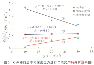 以普光B井為例來說明所建立的產(chǎn)能評價方法。首先,利用第2部分建立的井底流壓取值深度優(yōu)化方法,得出普光8井第8~11層的累積產(chǎn)能為總產(chǎn)能的1/2,即取第8層深度處的壓力為井底壓力;其次,利用第3部分的井筒壓力分布計算模型,計算出第8層的井底流壓;第三,對該井資料進(jìn)行處理,并進(jìn)行壓力平方法回歸,其結(jié)果見圖6。
