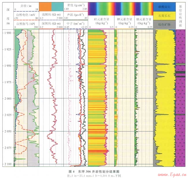 巖心資料、元素俘獲測井和常規(guī)曲線的結合給出了東坪氣田基巖儲層的巖性識別與劃分結果,表明北部的3區(qū)以花崗巖為主,夾有薄層的中基性侵入巖脈,侵入巖脈的厚度多在1~3m之間(圖4),與計算的孔隙度等參數對比,認為侵入巖脈可作為儲層,且由于侵入主要是沿斷層等進行的,侵入過程誘導裂縫產生。因此巖脈的侵入對于儲層是一個積極的因素。南部的l區(qū)基巖以變質巖為主,圖4是北部東坪306井的巖性劃分結果。位于區(qū)塊東北角的該井為鈣質片麻巖,區(qū)塊內已鉆的其他井多為花崗片麻巖和斜長片麻巖,結合孔隙度、裂縫等參數分析認為巖性對物性的控制作用不明顯,這3種不同類型的變質巖都可以發(fā)育好的儲層。